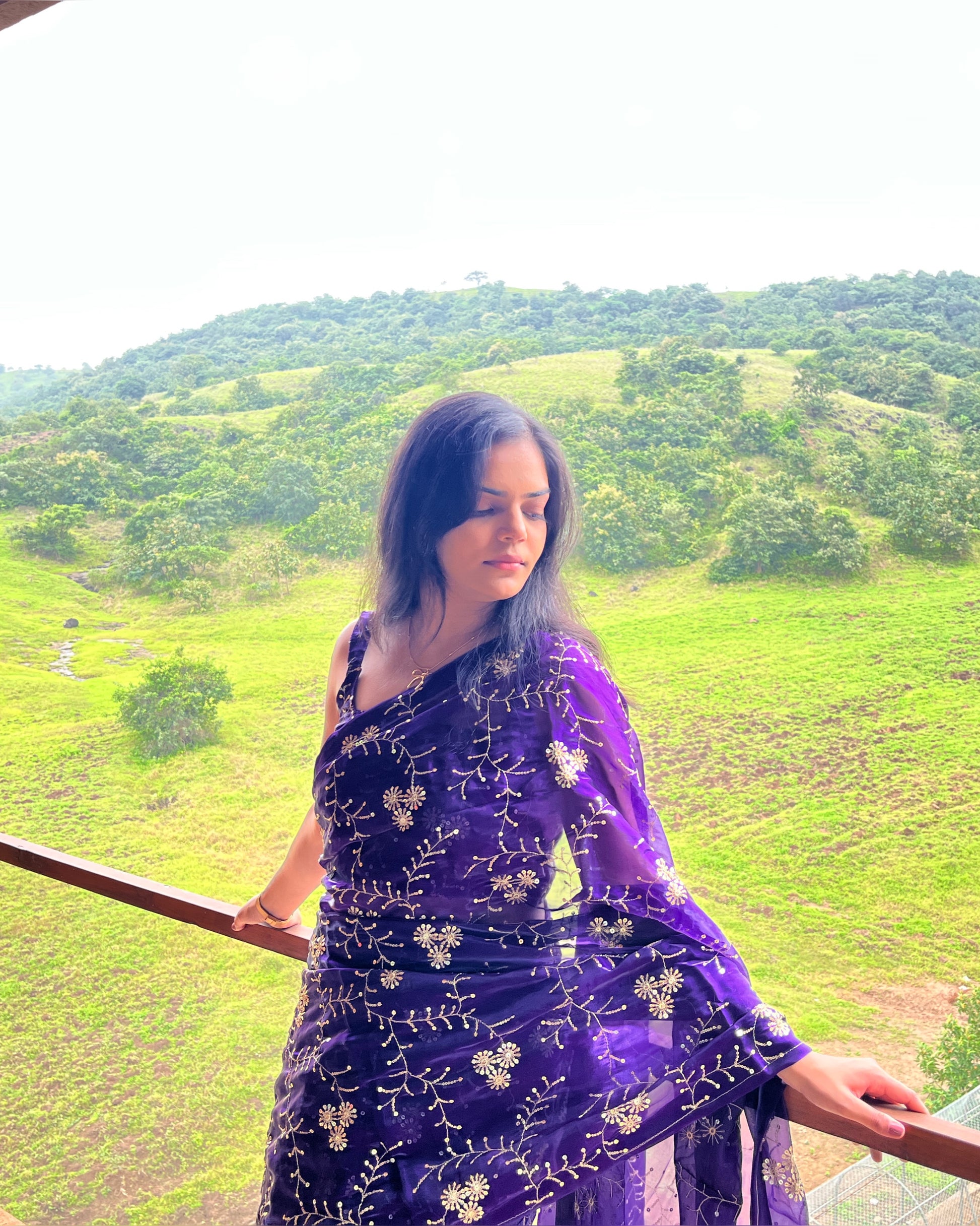 - The saree comes with a free size ready-made blouse. Sleeveless matching purple embroidered blouse.