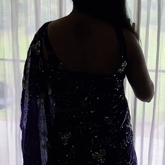 - This deep purple ready-to-wear saree comes with an integrated pocket and ready-made blouse.
